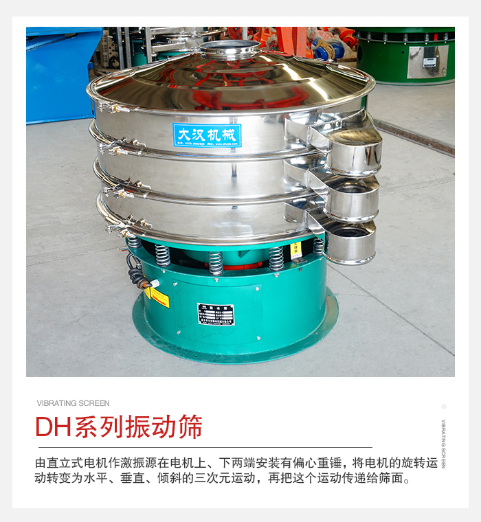 簡介:DH系列振動篩是一種高精度細(xì)粉篩分機械其振動運轉(zhuǎn)原理很多企業(yè)也稱之為“三次元振動篩”。